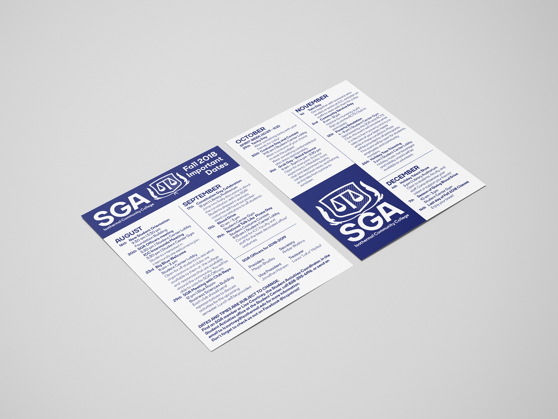 One of the first things that I had to do in this position was to create a flyer that had the important dates planned for the upcoming semester. I made sure that the text was easy to read and that I kept it consisted with the new brand identity. It was a challenge to fit all the events and its information on two pages, but after adding or removing text without shrinking the text to make each section fit, these flyers ended up being filled with information without sacrificing legibility.