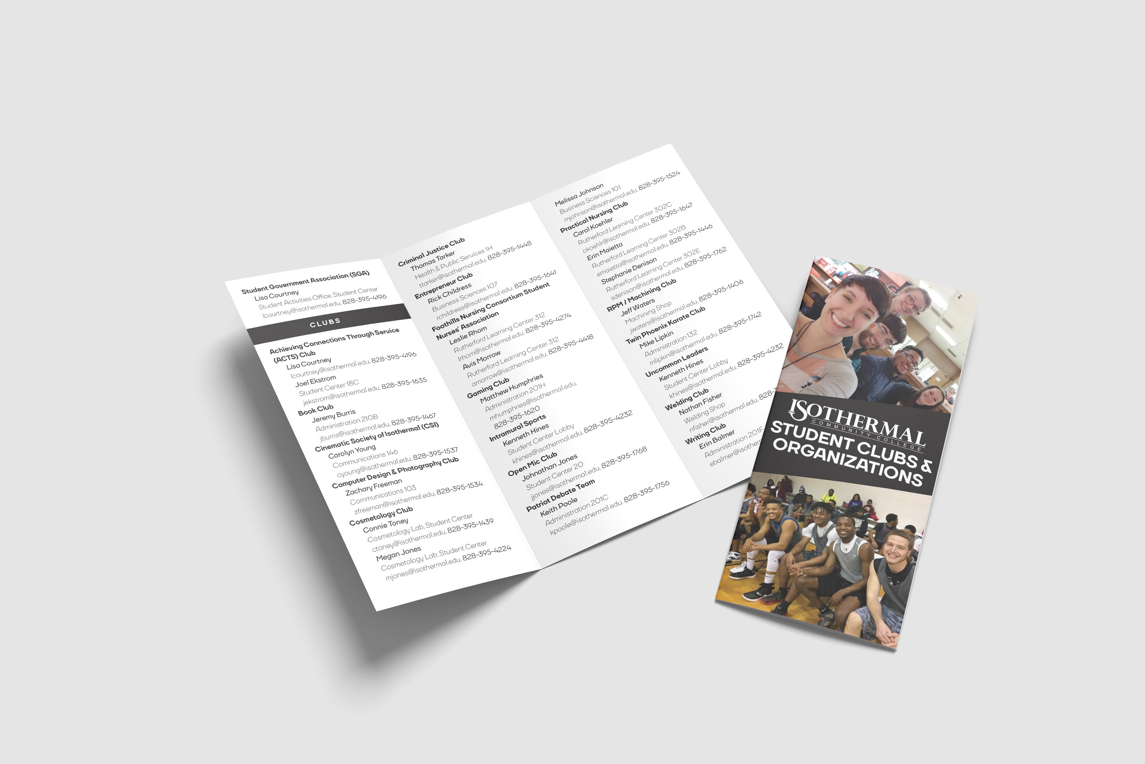 Another important project was the tri-fold brochure with all the student clubs and organizations offered at Isothermal Community College at the time it was created. It was a challenge to fit all of the clubs in with their respective contact information while maintaining legibility, but I was able to overcome it after a lot of trial and error and spacing adjustments.