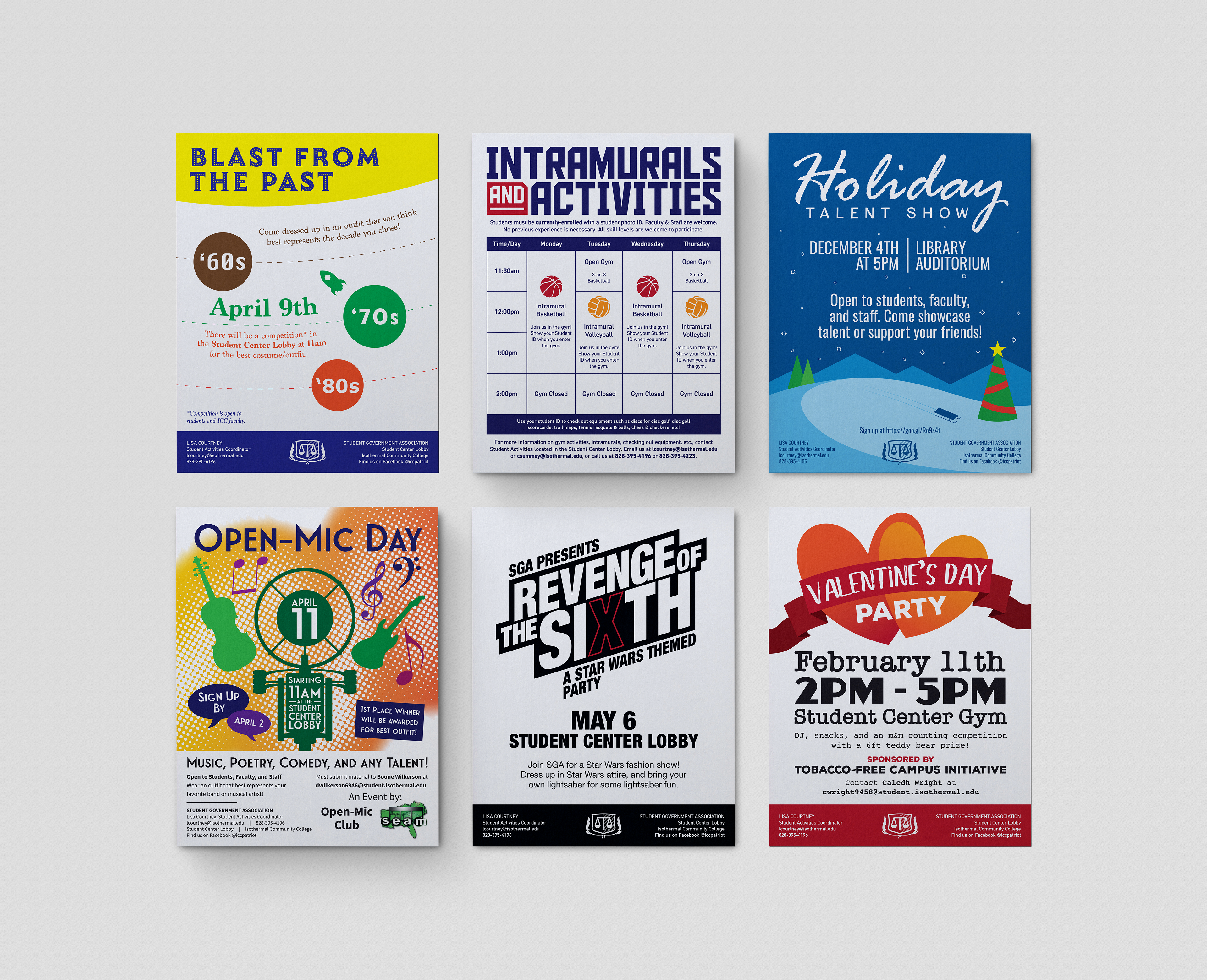 Below are a handful of the flyers I created for the Student Government Association. Most of the flyers that I made for various events have a common footer design that comprises of the logo and contact information. This gives even the most different looking event flyers a something consistent. The flyers that do not have this common footer are usually ones that promote events that are run by other clubs or are not purely an SGA event.