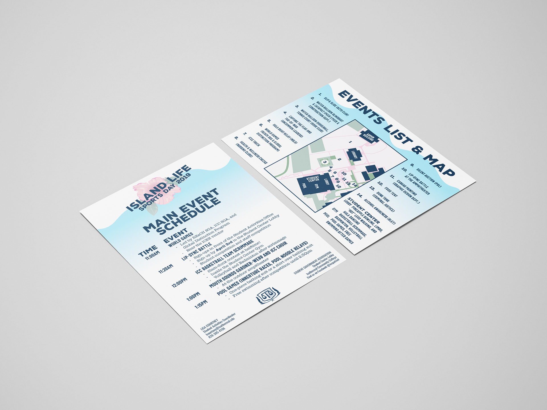 For the Sports Day 2019 event, I created an accompanying flyer to give more information of when and where each event will take place as well as the location for each of the participating club booths for the day. The campus map I created prior became a useful addition to the flyer once I recolored a section to match the color theme I put together for the event.