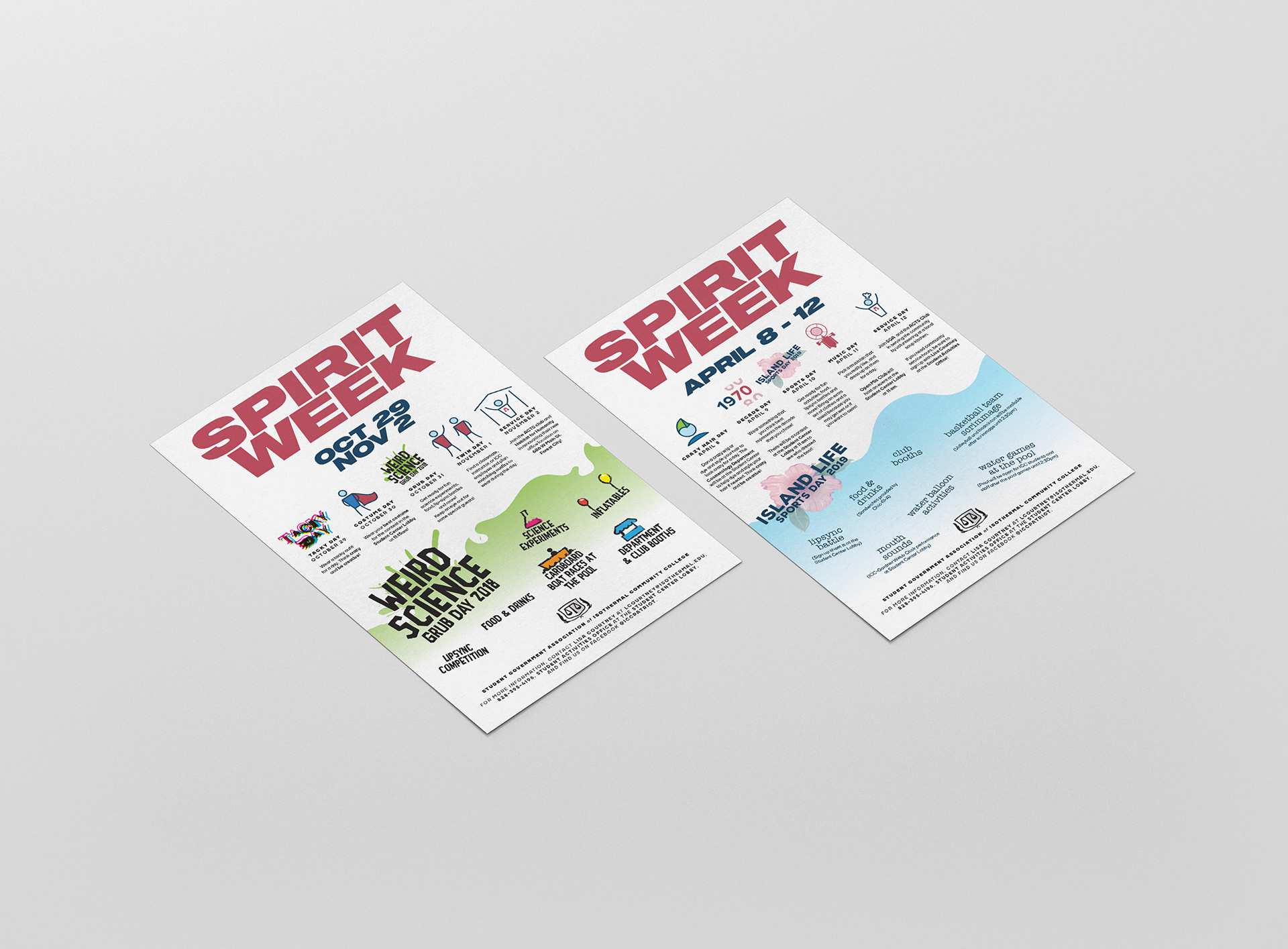 The two largest events of the year are Sports Day in the Spring and Grub Day in the Fall. As a way to hype up the student body for the main events, the Student Government Association is responsible for planning a Spirit Week with various smaller events. I had to design a poster that could catch the attention of the student body as well as informing them of the various events they should expect for the respective events.