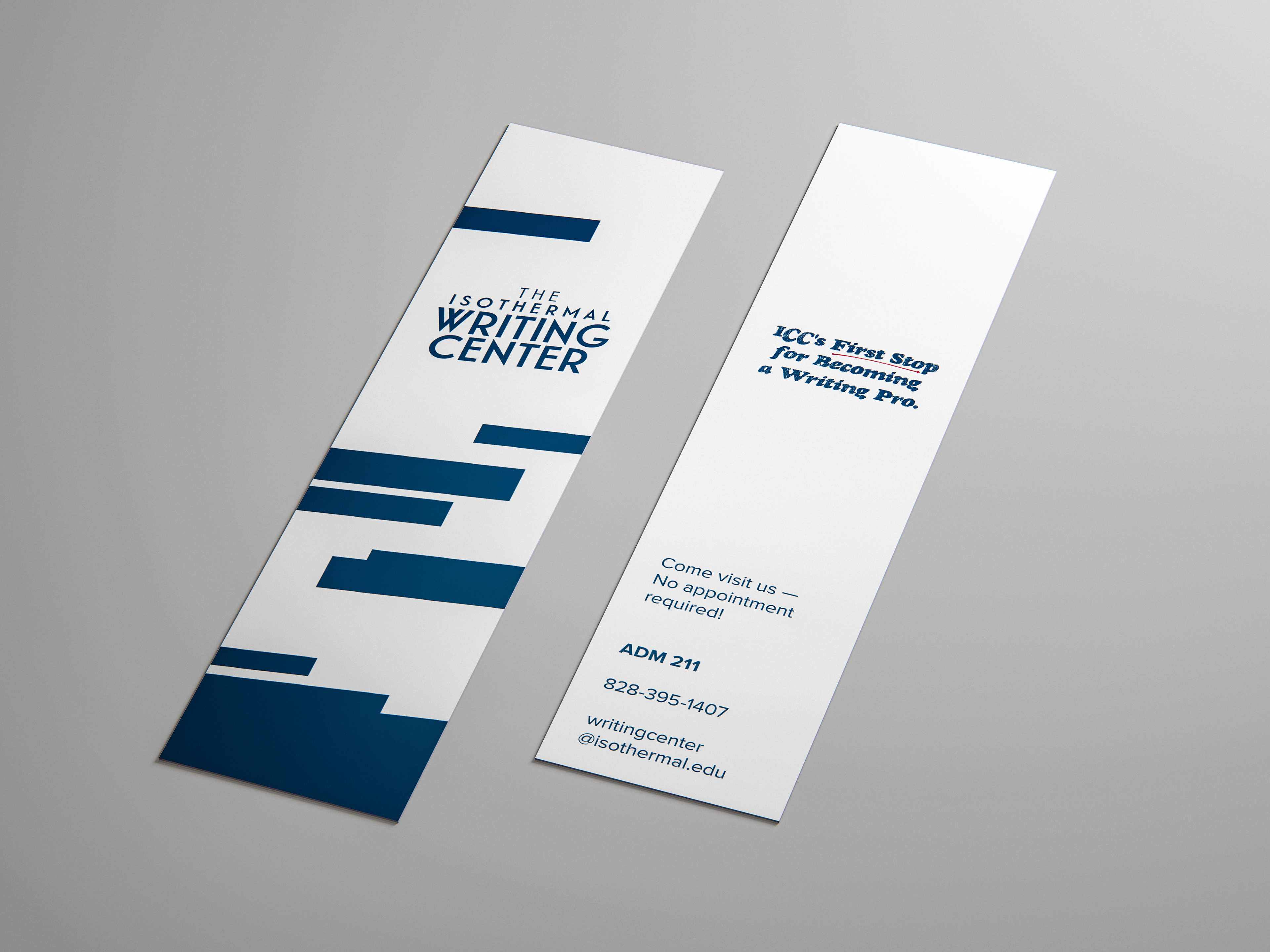 When I was still studying at Isothermal Community College, I utilized the Writing Center a lot to get my essays proof read and discuss topics. The Writing Center eventually became a big supporter of my graphic design work and were present at my graphic design portfolio show. Years later, they came up with the idea to have bookmarks that they can hand out with the contact information for the Writing Center. A tutor commissioned me for this project, and I enjoyed designing this bookmark. I wanted to keep the Isothermal blue color in the design to keep it consistent with the college's colors, and I made sure the text would fit and be legible when printed.