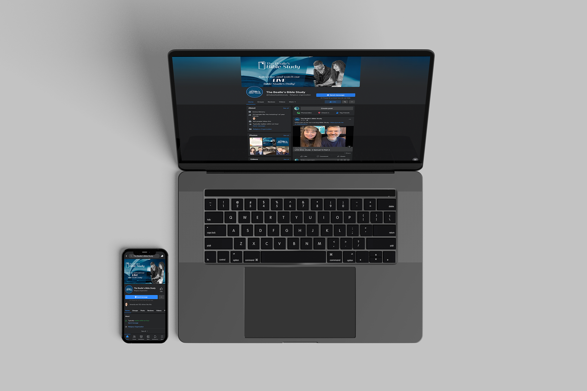 On top of the YouTube banner, they wanted the Facebook page and group cover photos to look similar but also distinct from it. There is another photo of a Bible in the background with a different photo of the Bealles with the logo as well as more text telling the viewer what they offer.